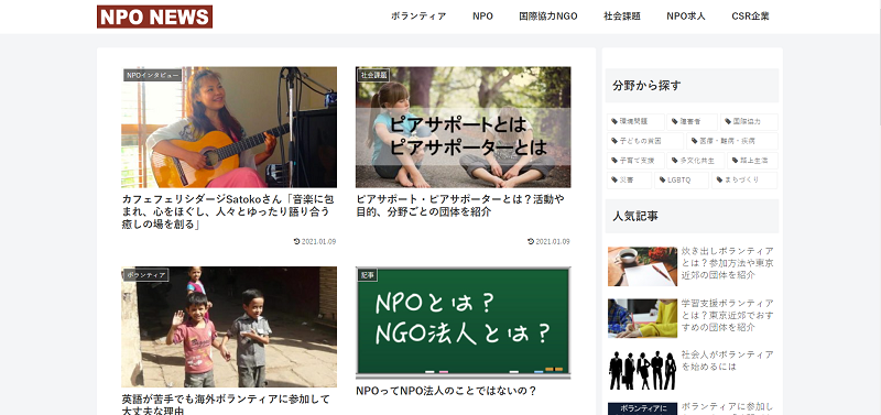NPO新聞が運営するNPOニュースは、ボランティア、NPO/NGO、社会課題、ソーシャルビジネス、企業の社会貢献活動などの情報発信をするウェブメディアです。寄付というよりボランティアがテーマ、社会人というより学生をターゲットにしたメディアに見えます。